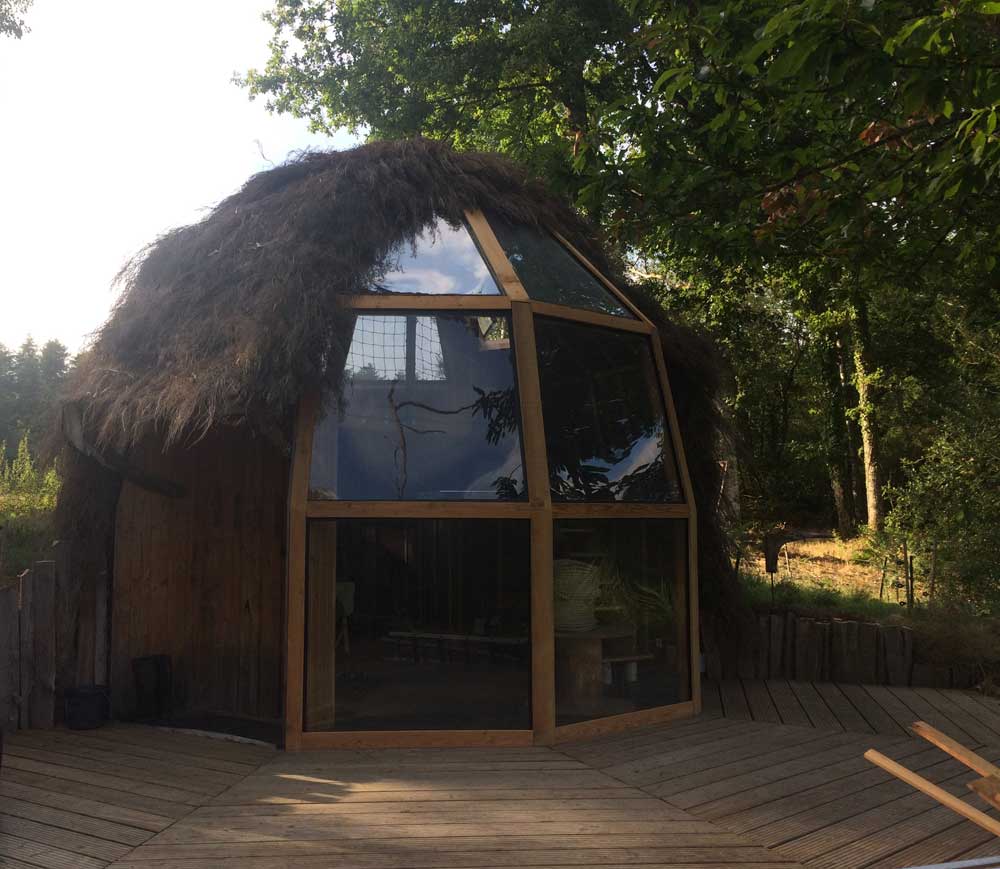 Construit prés d’un étang propice à l’observation de la faune et la flore sauvage, il est près d’un châtaignier multiséculaire « gardien des lieux ». Il est construit totalement en bois, partiellement enterré, et couvert de brémailles de Sologne.